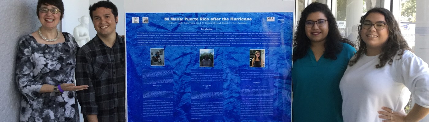 Banner photograph: Poster presentation on the Mi María Project at the UPRM XXV Simposio de Investigación en las Ciencias Sociales. L-R: Ricia Anne Chansky, Joe A. Centeno Reyes, Andrea Valdés Valderrama, and Brenda Y. Flores Santiago. April 25, 2019. Courtesy of Pura Arroyo Morales.